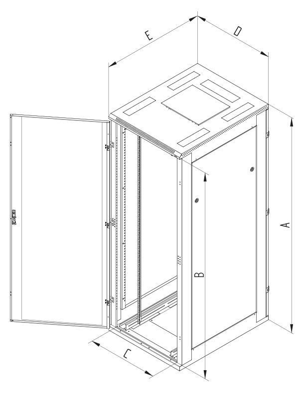 – Dveře jednokřídlé nebo dvoukřídlé ve variantách celoplechové, perforované (80 % a 86 % prostupnost)nebo prosklené s bezpečnostním tvrzeným sklem 4 mm. Mohou být na přední i zadní straně rozvaděče.