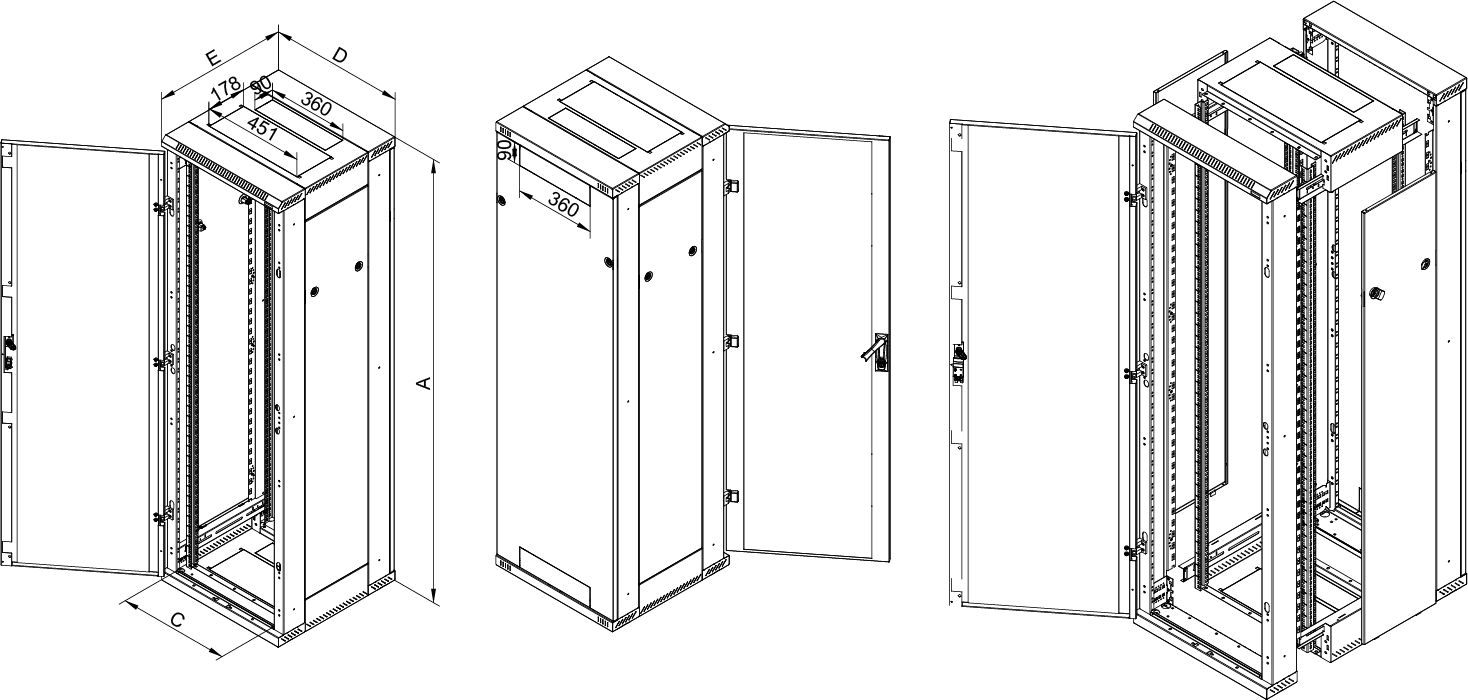 – dveře jednokřídlé nebo dvoukřídlé ve variantách celoplechové, perforované (80 % a 86 % prostupnost) nebo prosklené s bezpečnostním tvrzeným sklem 4 mm, které mohou být na přední i zadní straně rozvaděče,